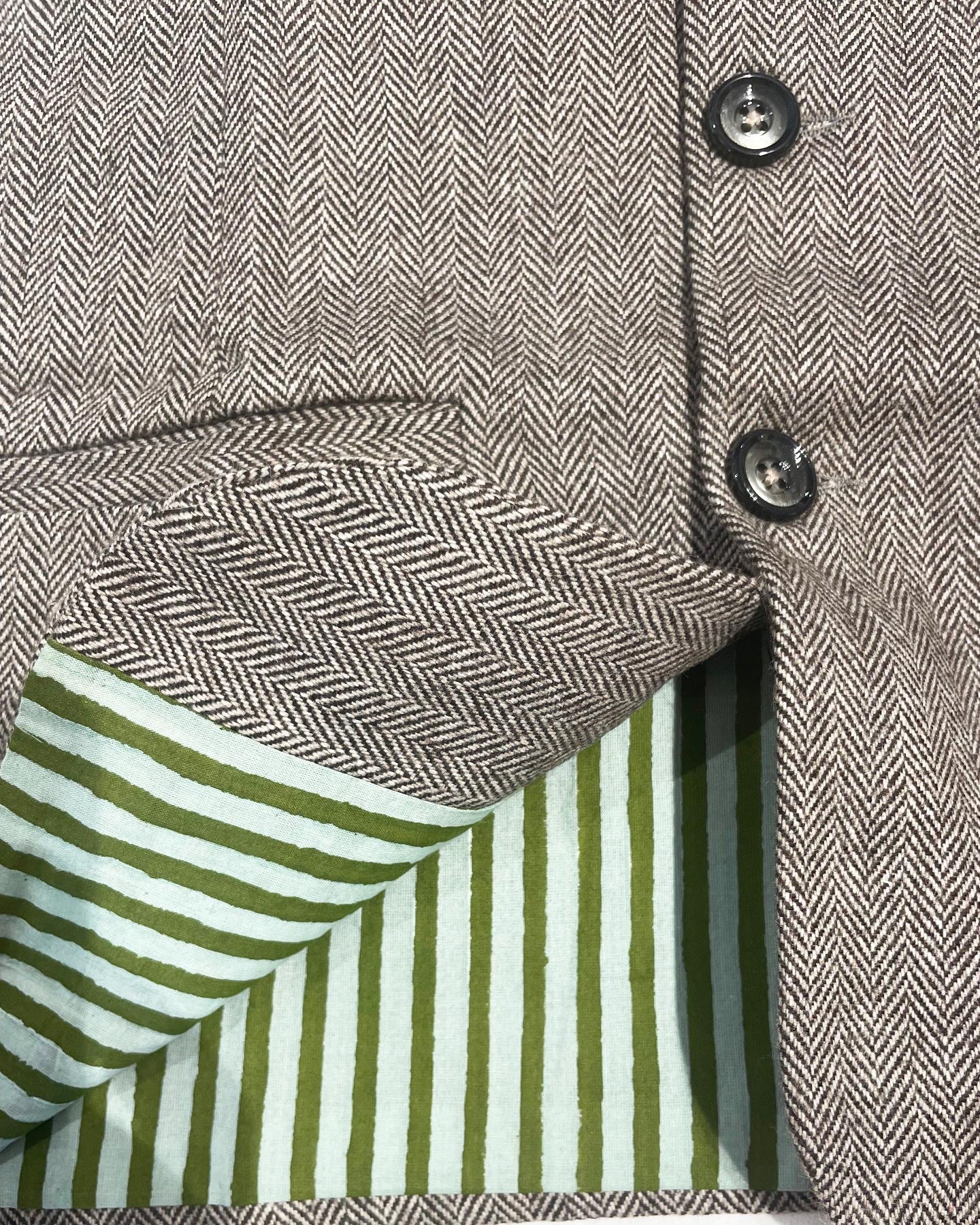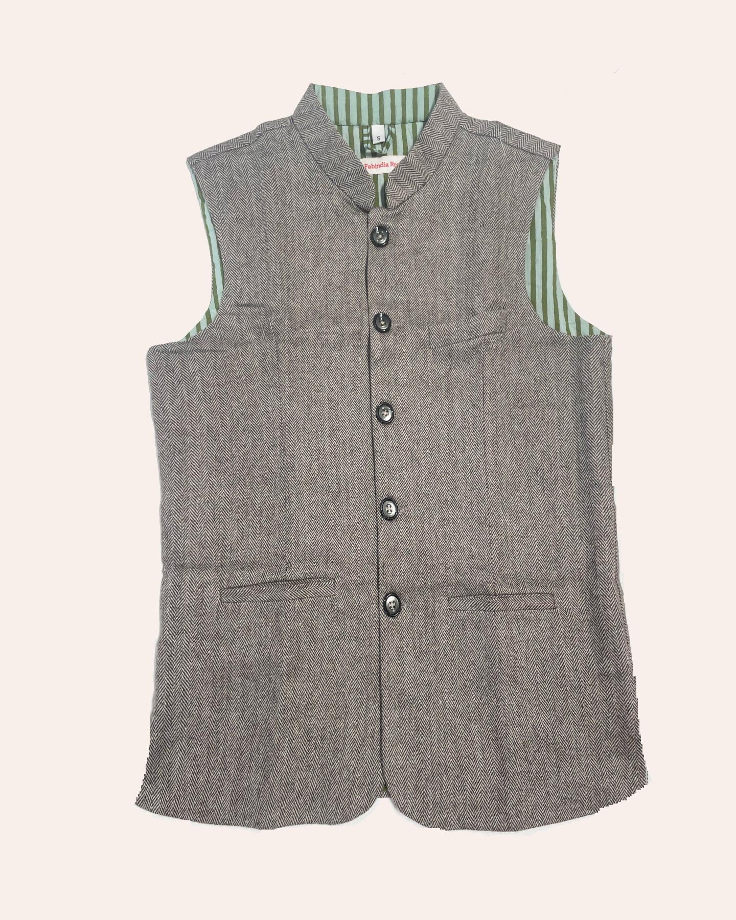 Un irresistibile e caldo gilet "Nehru Jacket" di tweed di lana dal taglio sagomato e con una fodera di cotone a righe colorata. Questo modello è la versione piu' corta della nostra classica Nehru Jacket. La vestibilità di questo gilet si adatta bene a persone di corporatura piccola e media. E' un capo perfetto per l'Autunno, Inverno e Primavera .