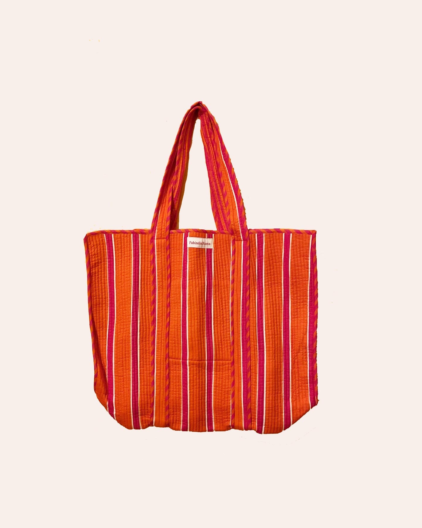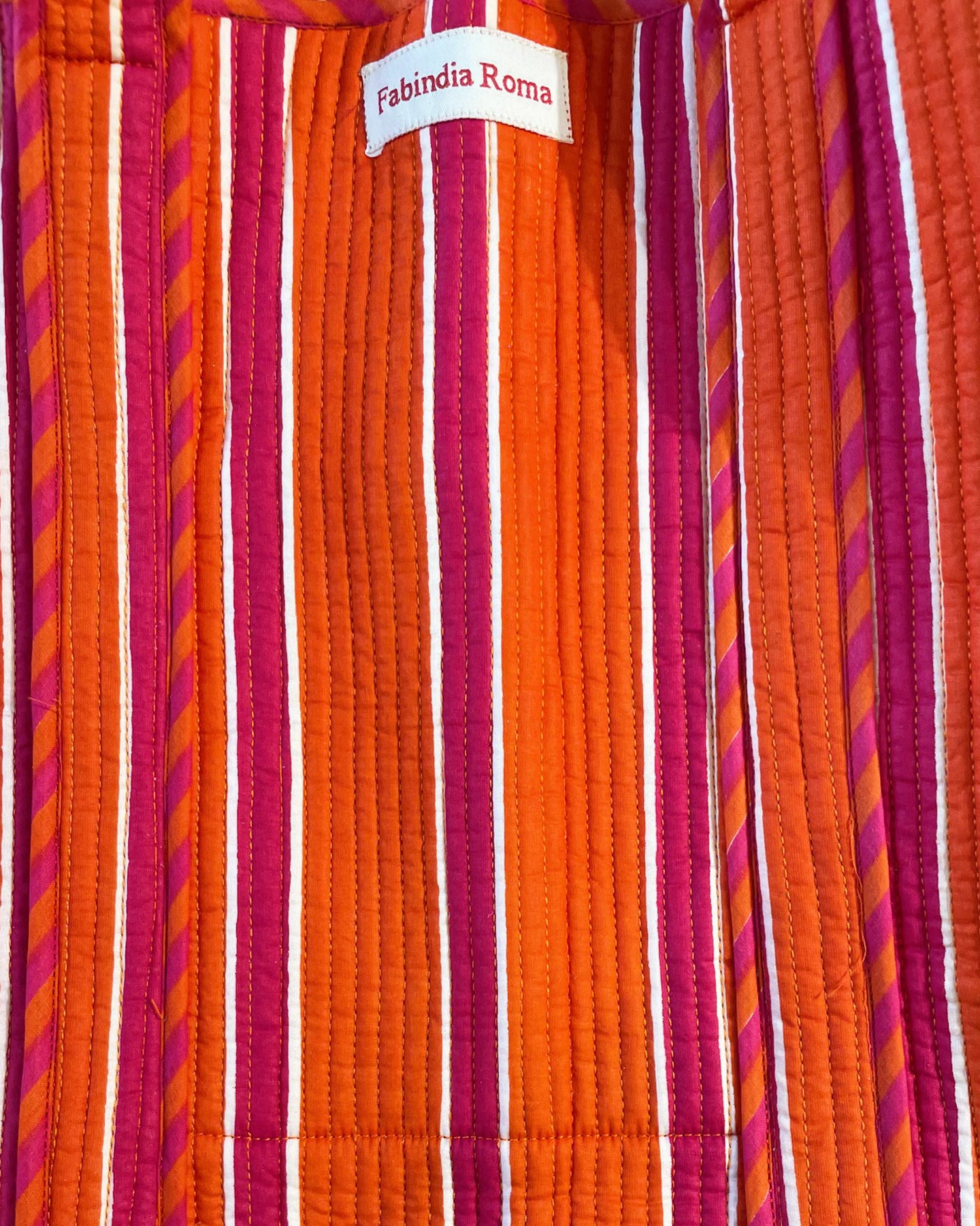 This quilted cotton bag is lined with a striped fabric  and it has a small pocket inside. The Shopper Roma is a fun bag, ideal for every occasion, in the city, by the beach or for a pic nic in the country side. Our fabrics and designs are unique and may display irregularities due to craftsmanship. We recommend washing in cold water, no dryer.