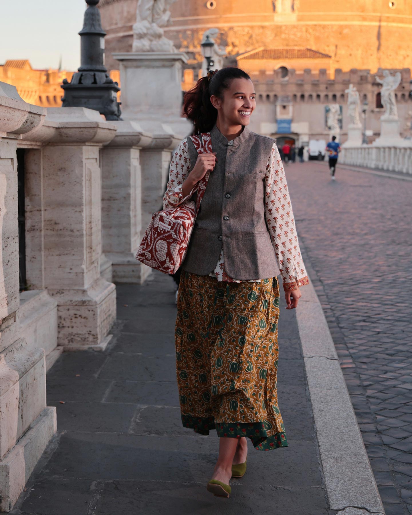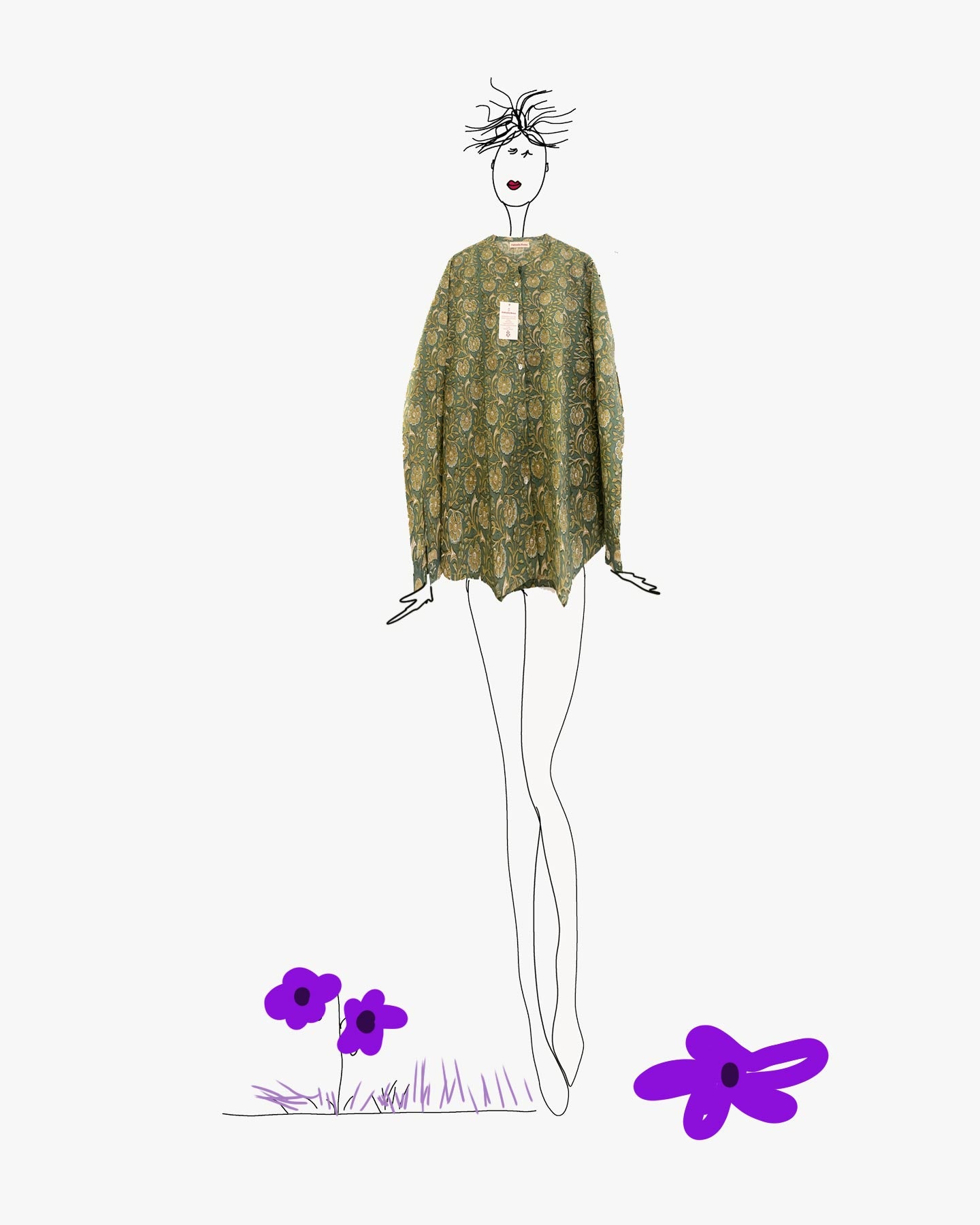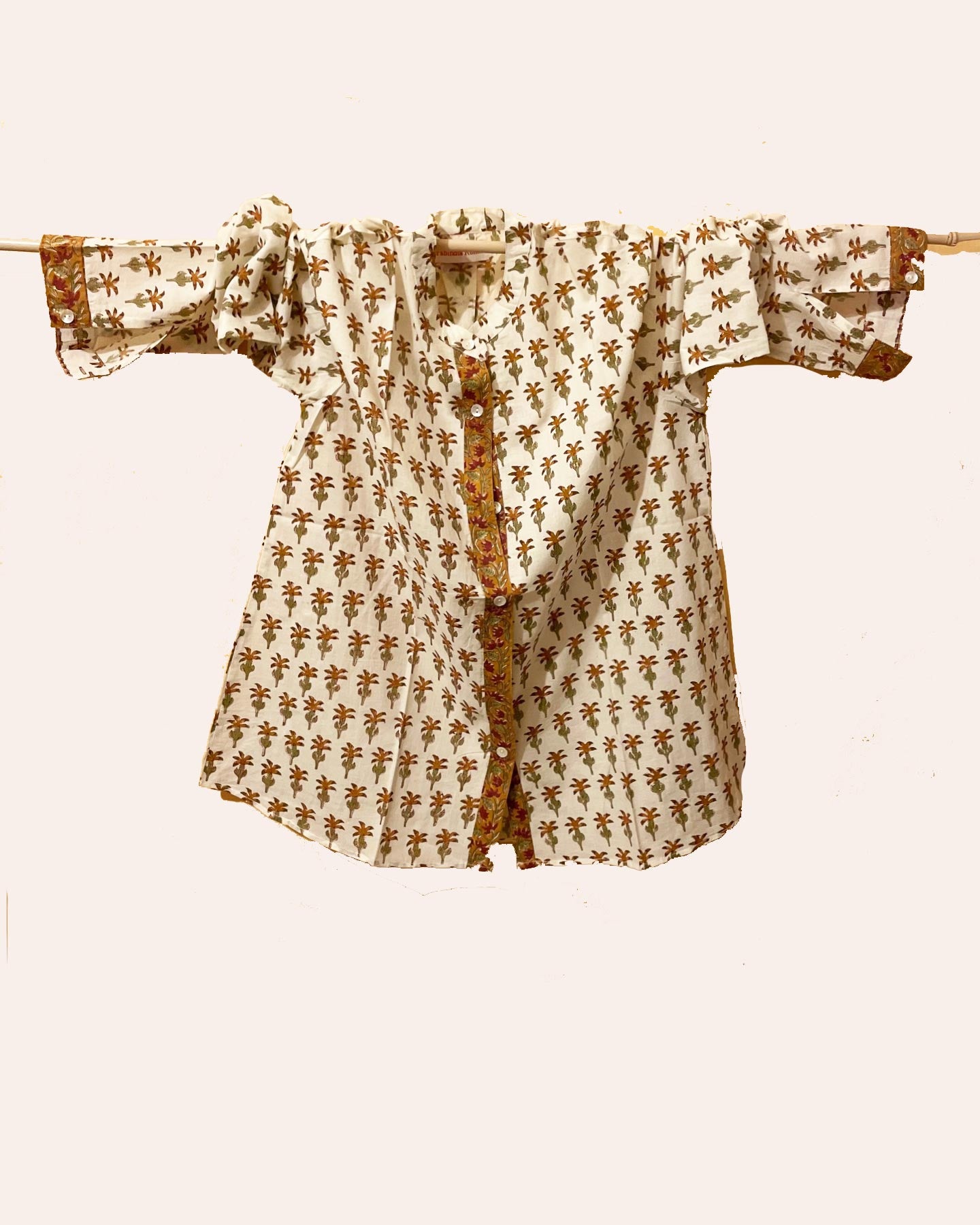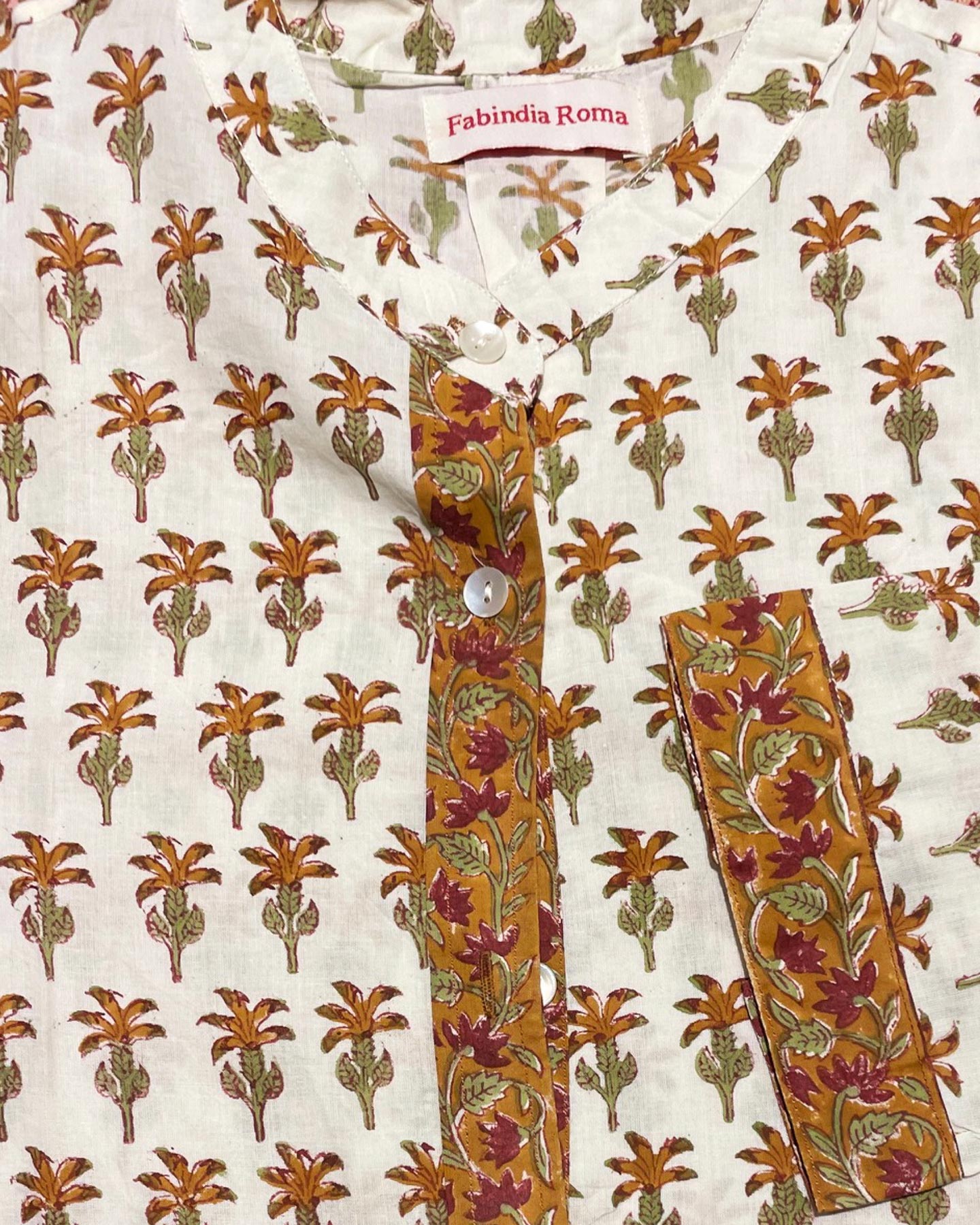 Questo modello di camicia a taglia unica, è utilizzabile in tutte le stagioni, non è molto lunga e si allaccia con bottoni davanti. Inoltre ha i polsini , un collo "Nehru" non molto alto e dei piccoli cugni all'altezza del torace . Si adatta bene a persone di corporatura piccola e media. Come tutti i nostri capi, il tessuto ed il modello è unico nel suo genere e presenta delle irregolarità dovute alla lavorazione artigianale. Si consiglia il lavaggio a freddo.