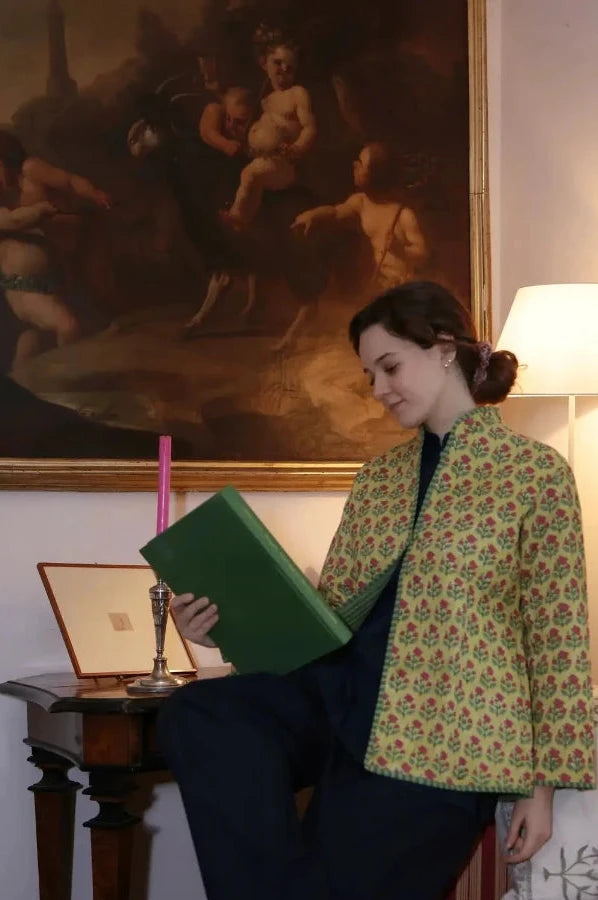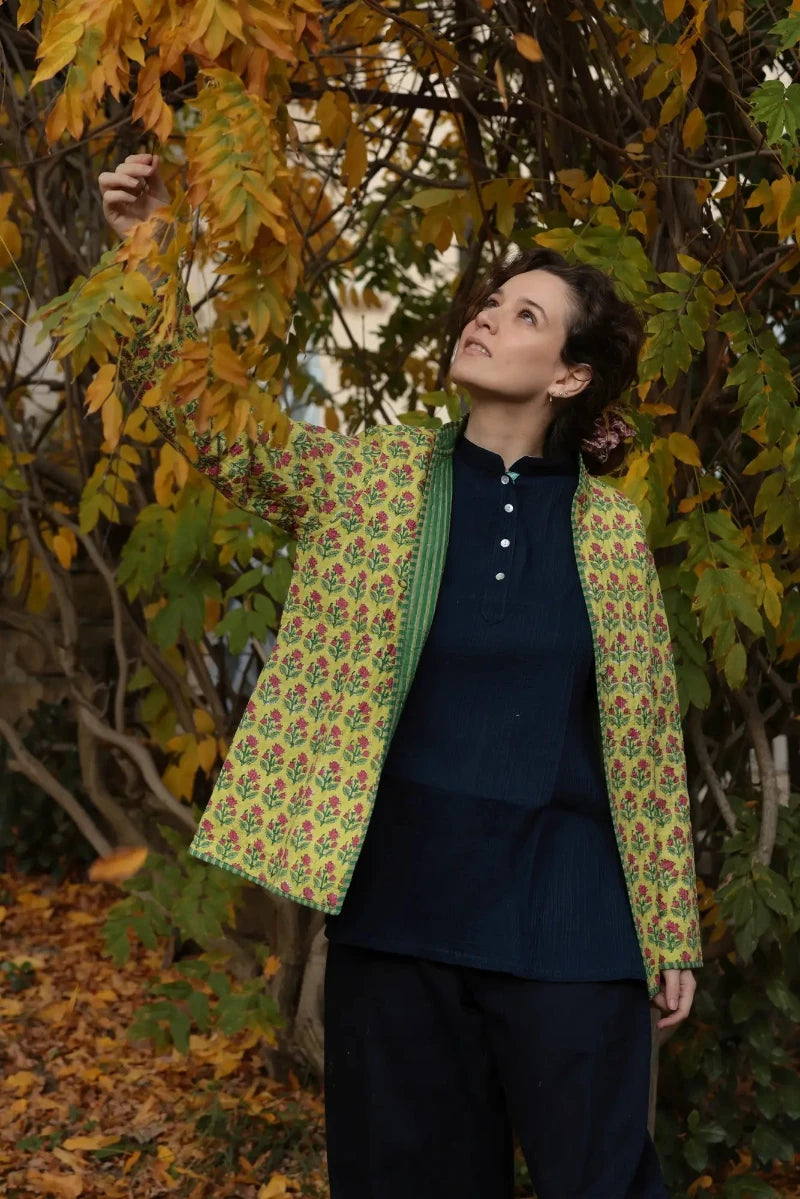 Reversible cotton quilted jacket with side pockets (removable if the jacket is turned inside-out). The cut is slightly flaredThe jacket’s lining matches the outside print. This jacket is available in a variety of different color combinations. We enjoy creating  new and distinctive combinations that are suitable for any occasion.