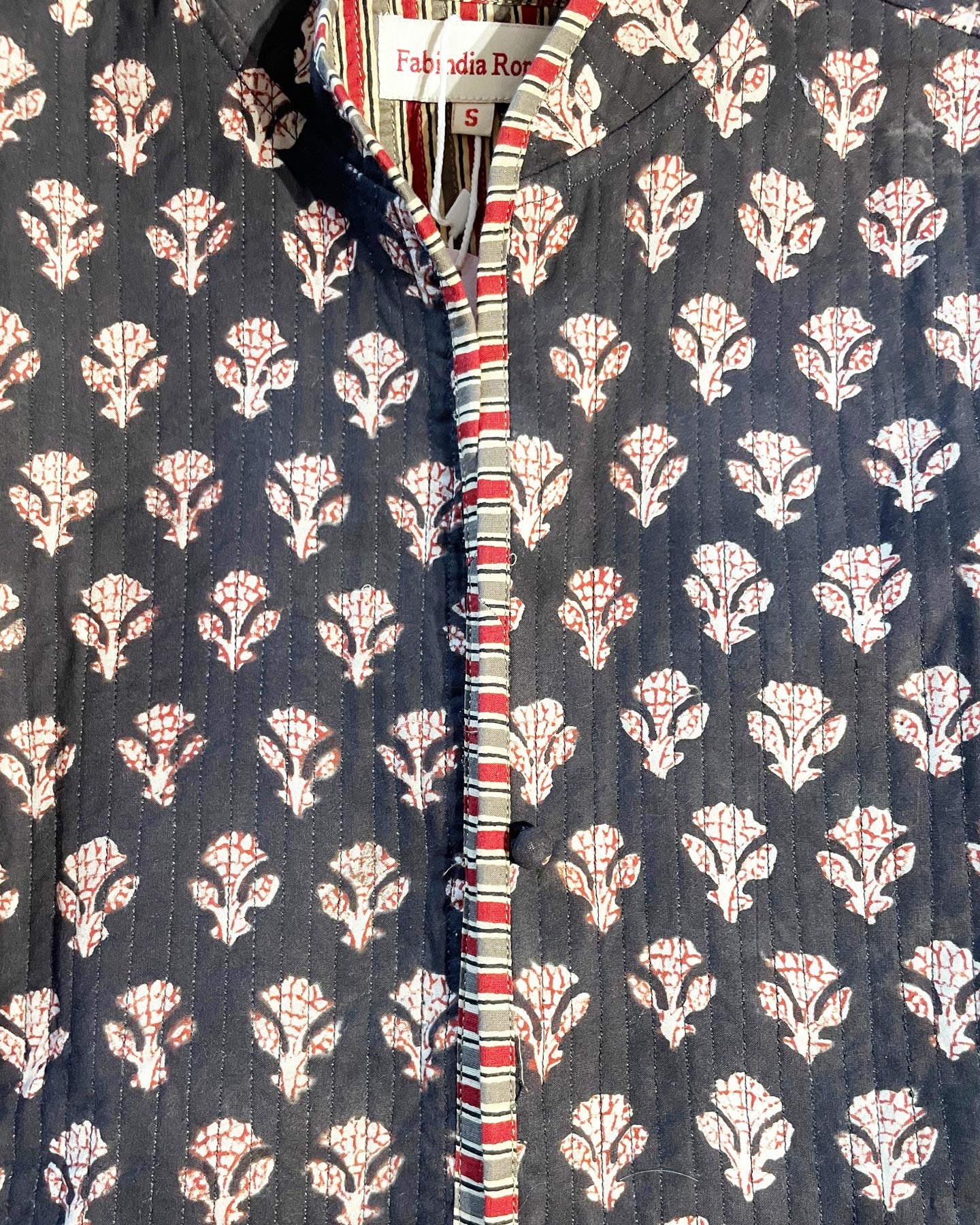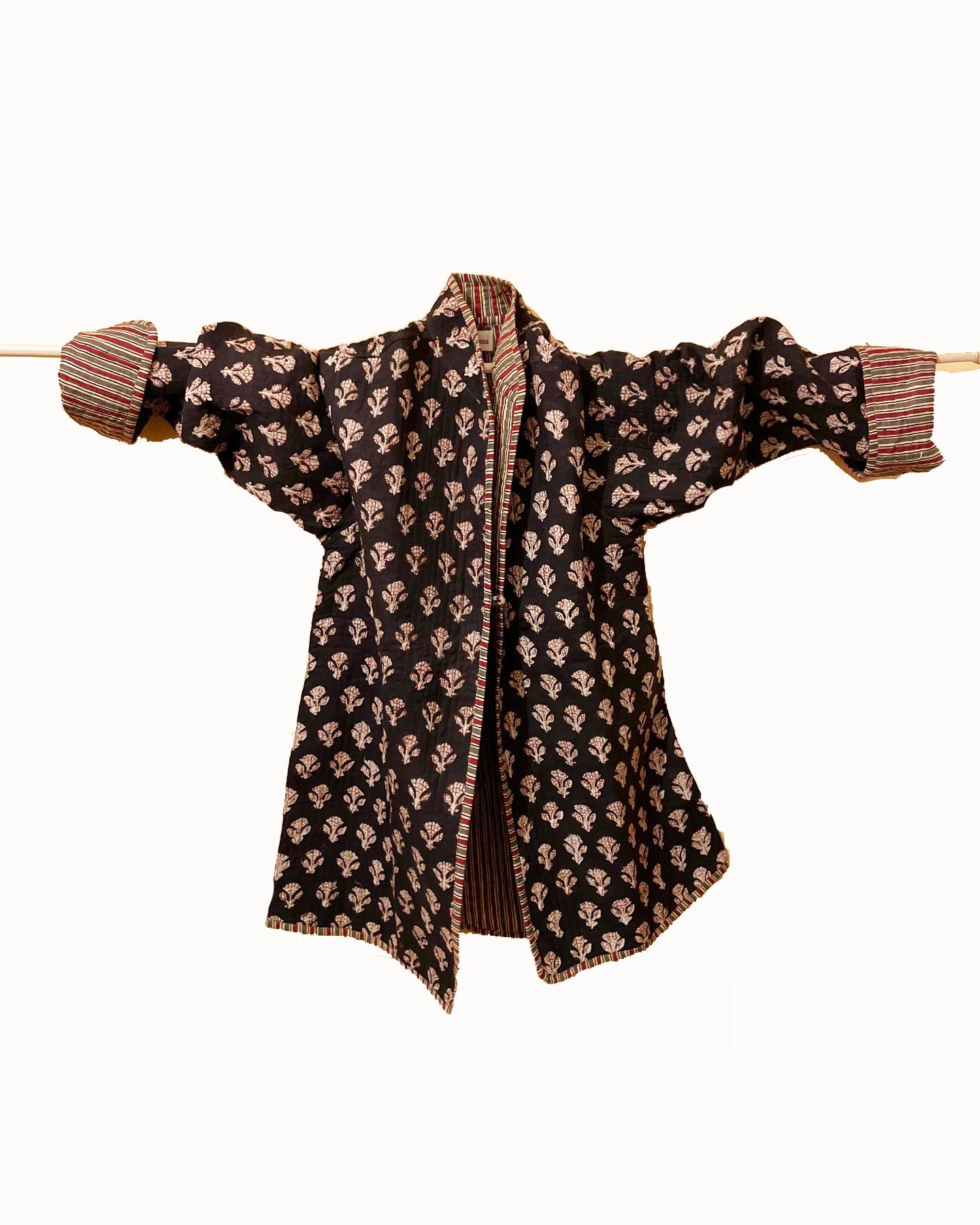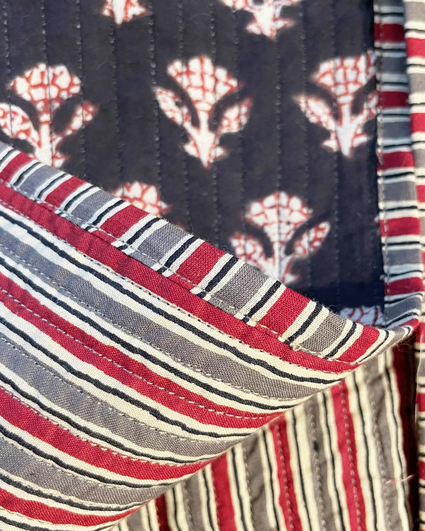 Reversible cotton quilted jacket with side pockets (removable if the jacket is turned inside-out). The cut is slightly flaredThe jacket’s lining matches the outside print. This jacket is quilted with no filling so it is very soft. We enjoy creating  new and distinctive combinations that are suitable for any occasion.