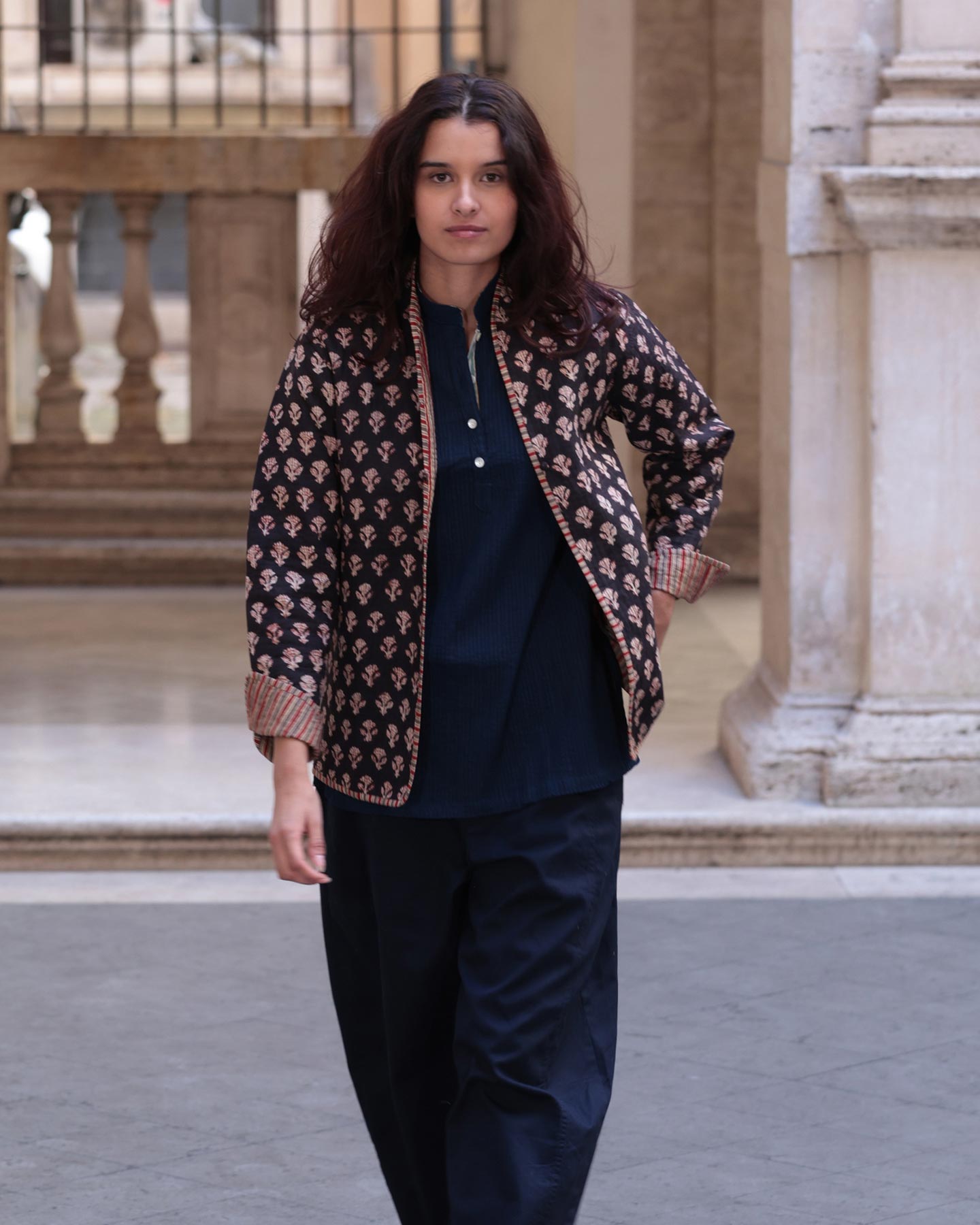 Giacca trapuntata di cotone, reversibile, con tasche laterali (estraibili se la giacca viene girata dall'altra parte). Il taglio è leggermente svasatoIl tessuto interno della giacca è scelto in modo da combinarsi con quello frontale.