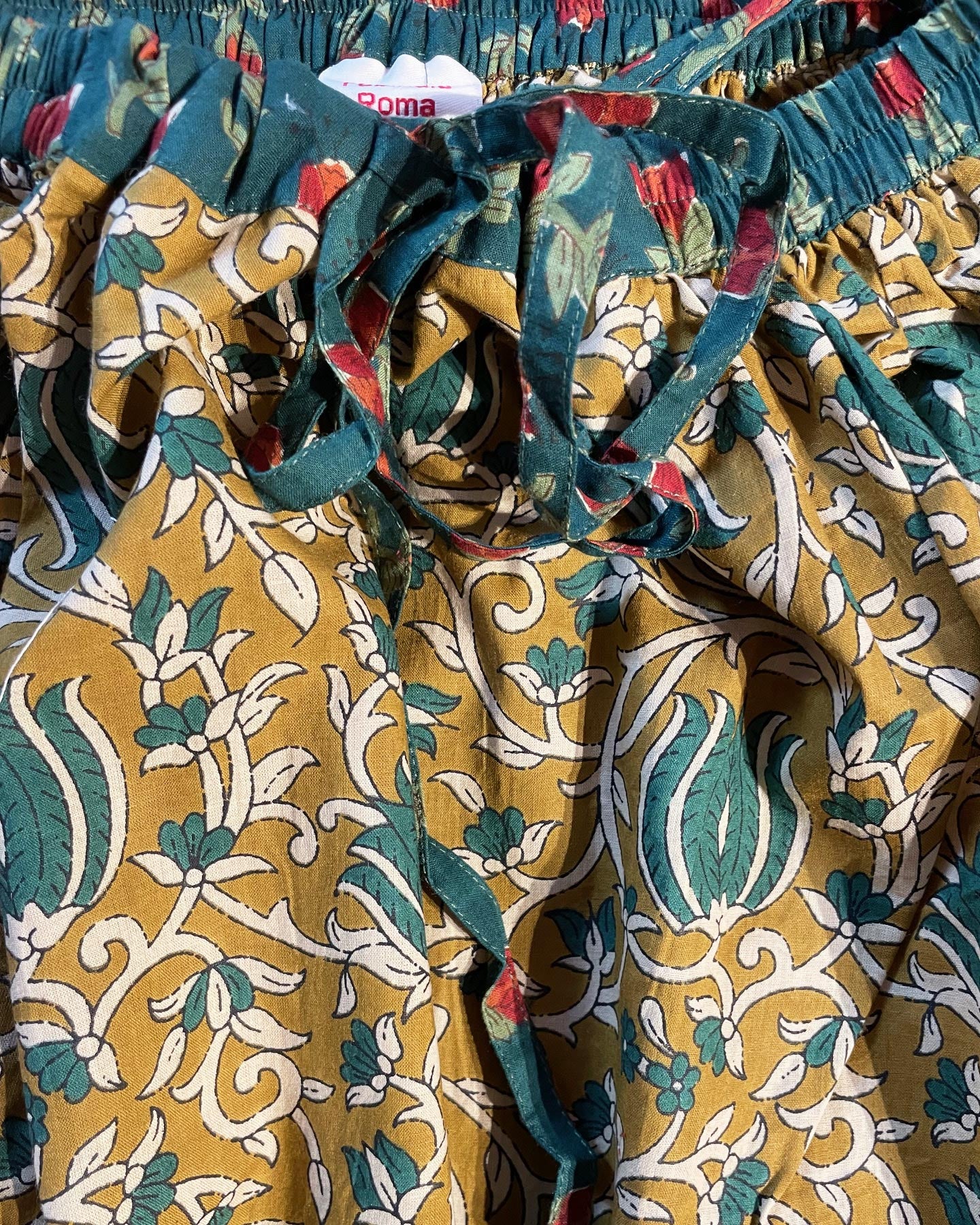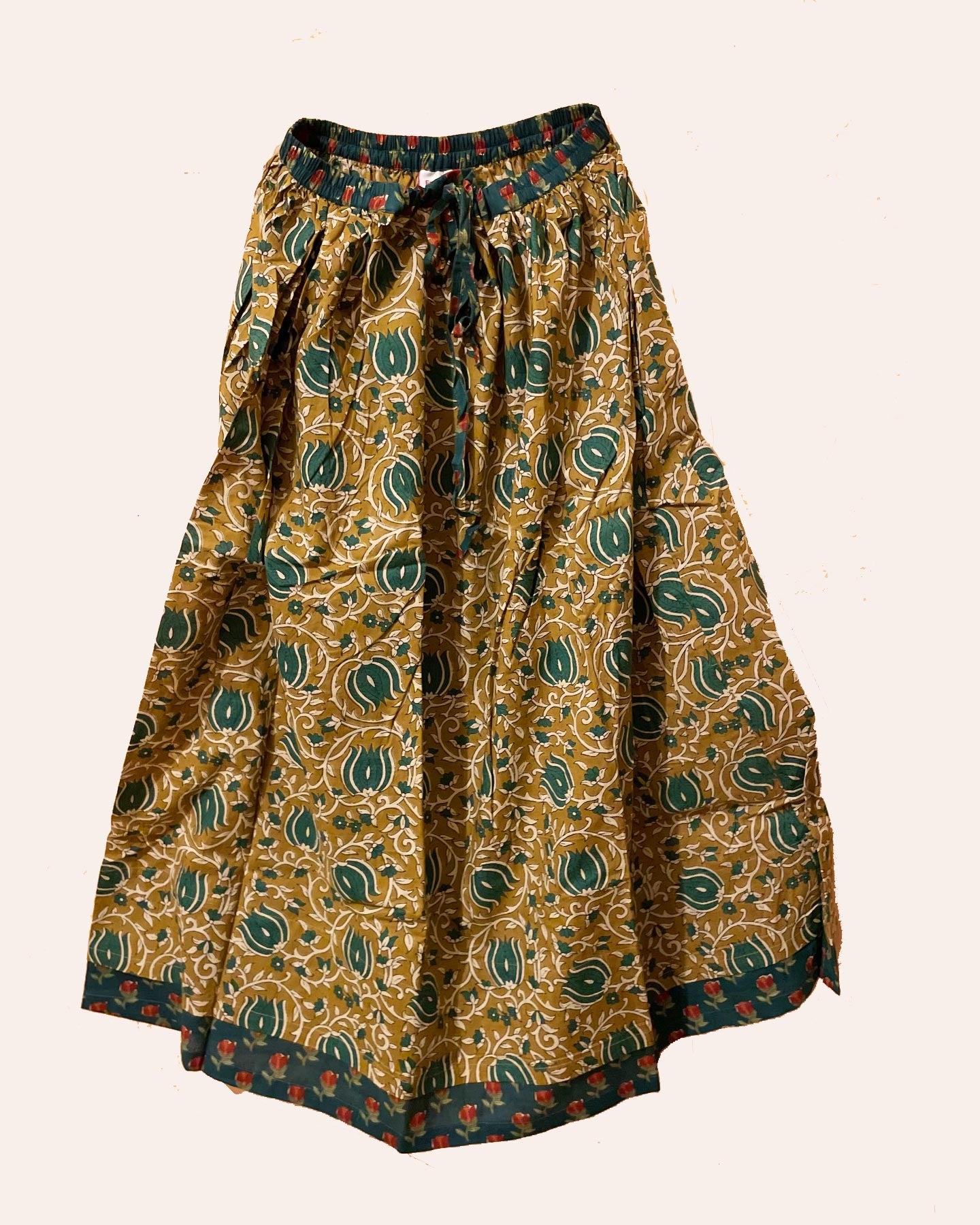 This long printed cotton skirt, has elastic and draw string on waist and a small flare on the bottom made in contrast printed fabric. It suits different body measurements and it is easy to wear in any occasion.