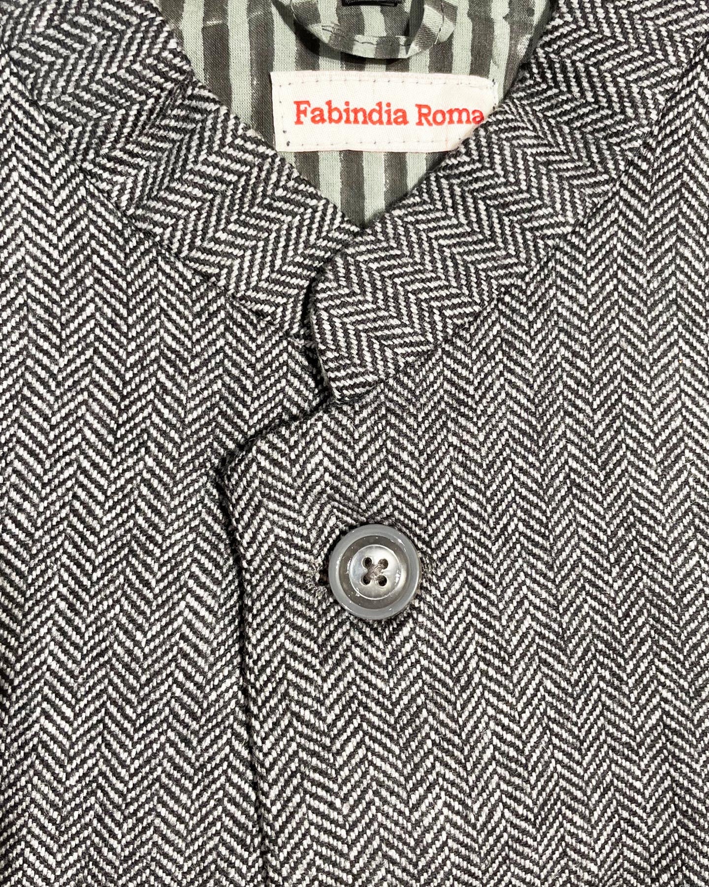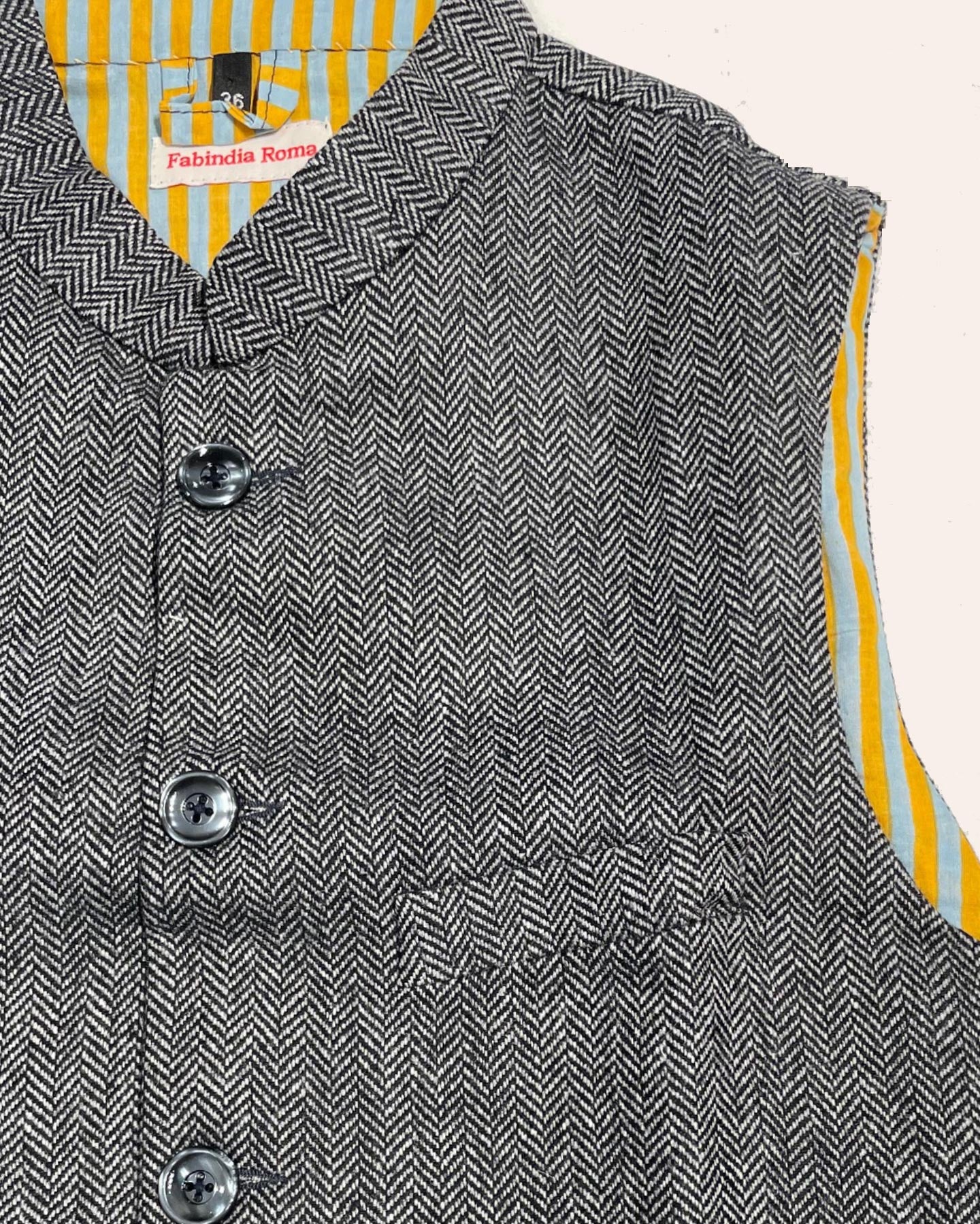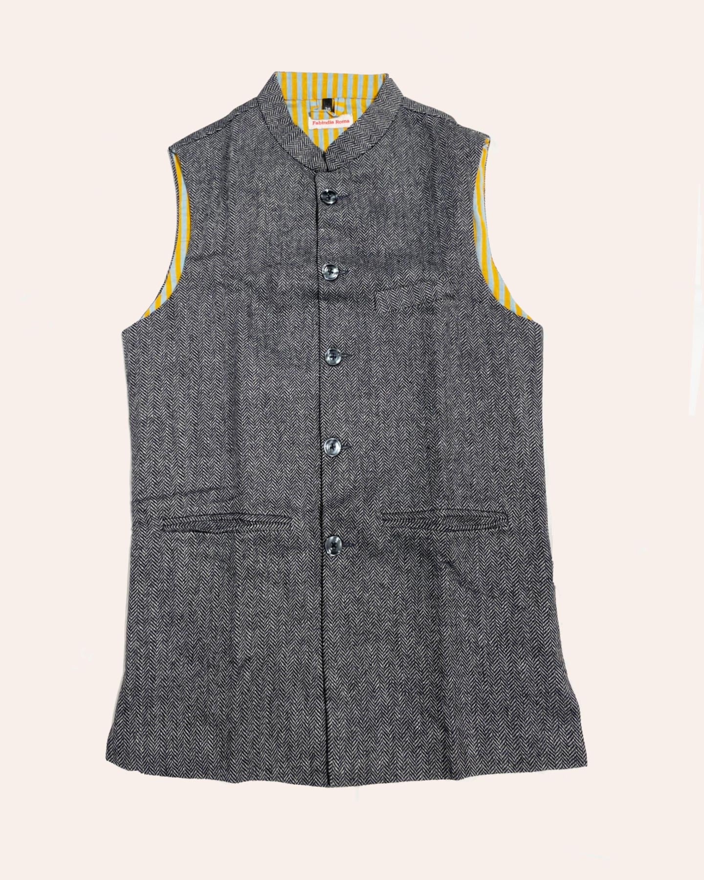 Fabindia Roma "Nehru Jacket", l'irresistibile ed elegante gilet di tweed di lana, modello che proponiamo sin dal 1999. Il suo nome deriva dal fatto che ci ispiriamo alla classica giacca senza maniche Indiana che indossava Jawaharlal Nehru (Il Primo Ministro Indiano dal 1947 al 1964). Abbiamo riadattato questo stile tradizionale ad un look contemporaneo ed elegante, visibile dalla scelta dei tessuti, dal taglio e dai dettagli delle fodere stampate. Si adatta bene a tutte le corporature. Come tutti i nostri capi, il tessuto e il modello è unico nel suo genere e presenta delle irregolarità dovute alla lavorazione artigianale.