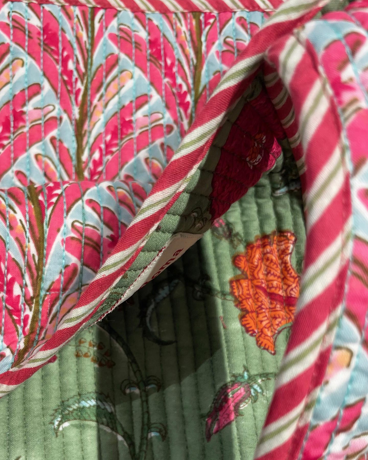 This quilted cotton bag is lined with a different printed fabric  and it has a small pocket inside. The Shopper Roma is a fun bag, ideal for every occasion, in the city, by the beach or for a pic nic in the country side. Our fabrics and designs are unique and may display irregularities due to craftsmanship. We recommend washing in cold water, no dryer.