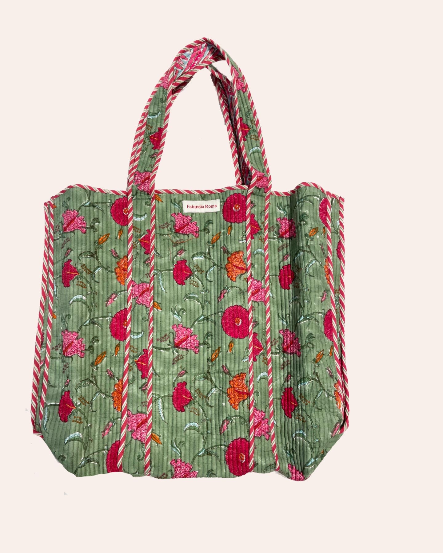 Borsa trapuntata di cotone stampato floreale con fodera interna di tessuto stampato diverso e tasca. La Shopper Roma è irresistibile, capiente e allegra per ogni occasione , in città , al mare e per un pic nic in campagna. Il nostro tessuto è unico nel suo genere e presenta delle irregolarità dovute alla lavorazione artigianale. Si consiglia il lavaggio a freddo, no asciugatrice.