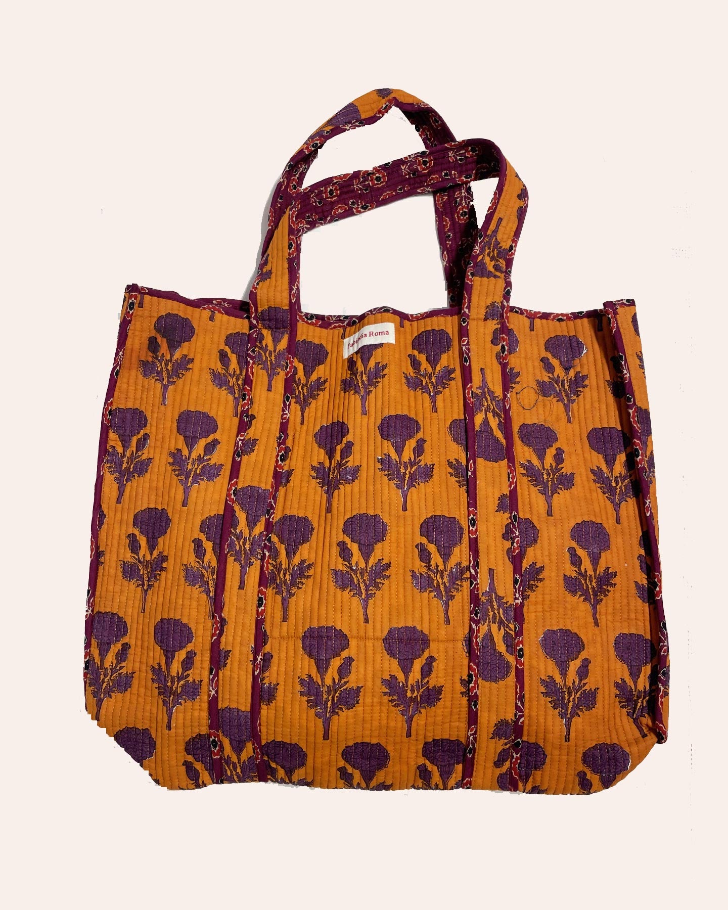 Borsa trapuntata di cotone stampato floreale con fodera interna di tessuto stampato diverso e tasca. La Shopper Roma è irresistibile, capiente e allegra per ogni occasione , in città , al mare e per un pic nic in campagna. Il nostro tessuto è unico nel suo genere e presenta delle irregolarità dovute alla lavorazione artigianale. Si consiglia il lavaggio a freddo, no asciugatrice.