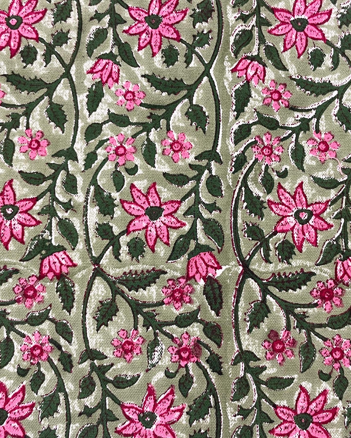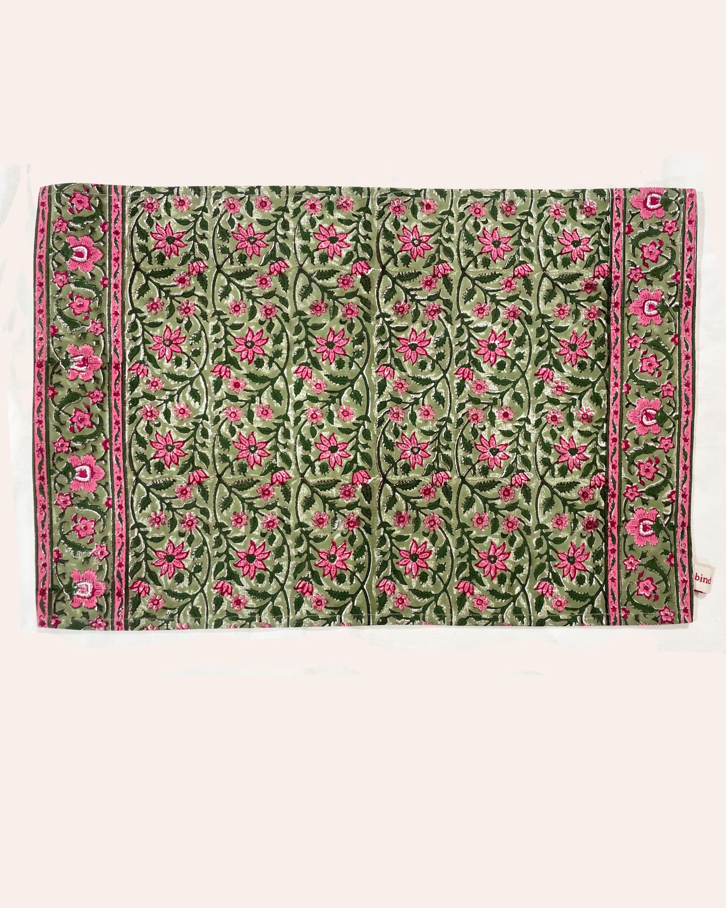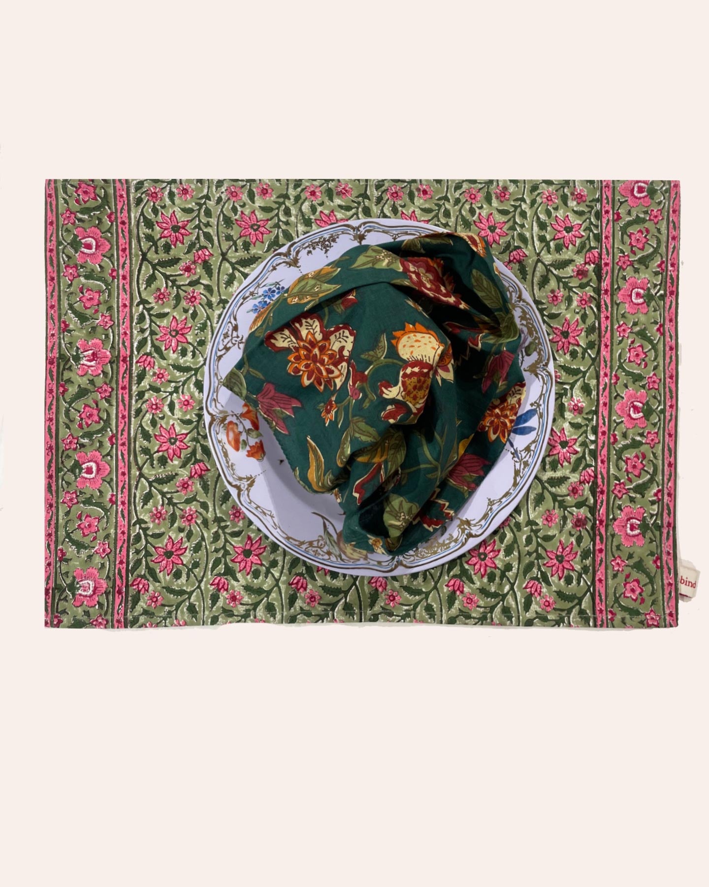 Cotton "canvas" placemat. This fabric is wood block printed. You can create associations of color and designs with our placemats that will enliven your dining table and your home's decor. Our fabrics and designs are unique and may display irregularities due to craftsmanship. We recommend washing in cold water.