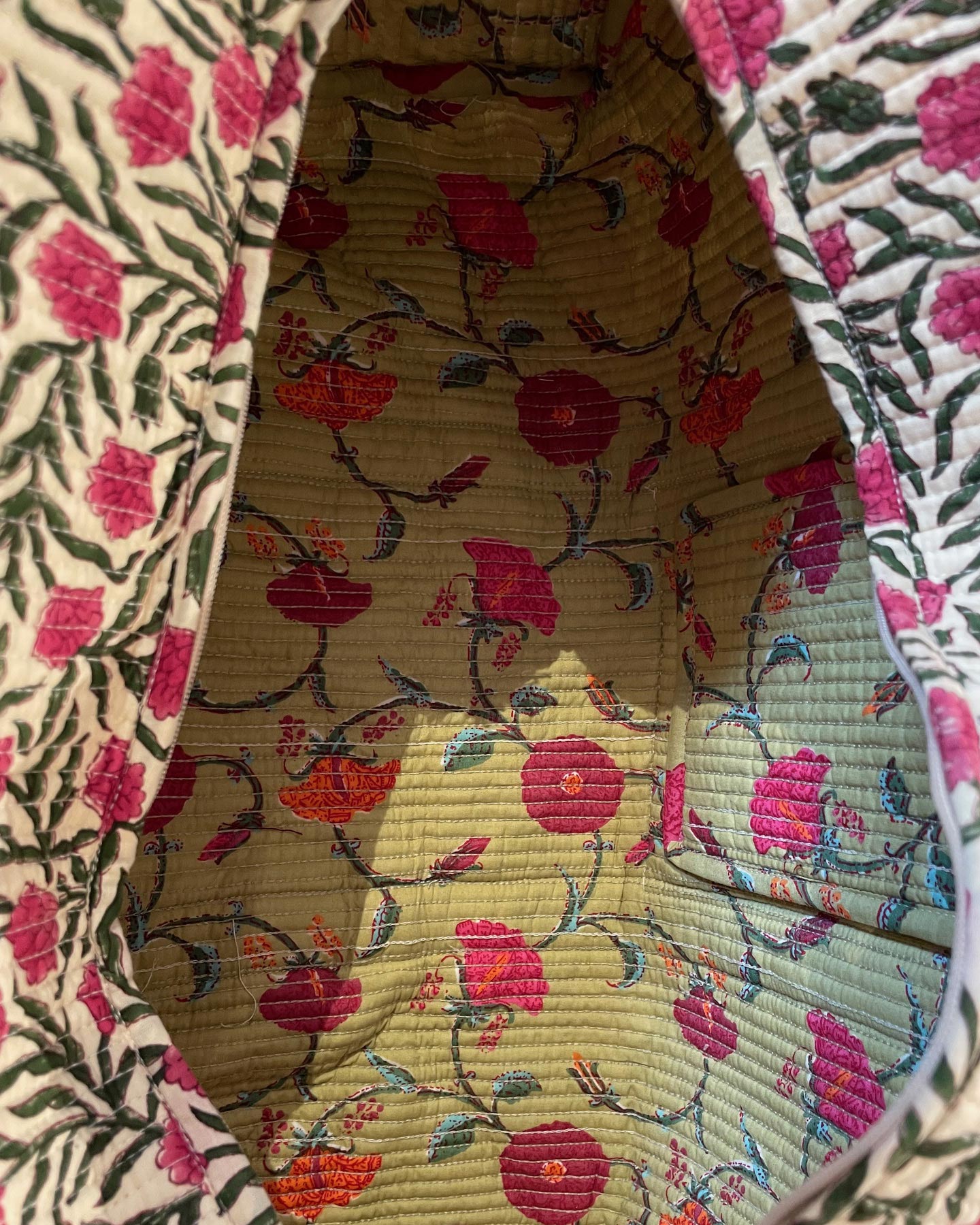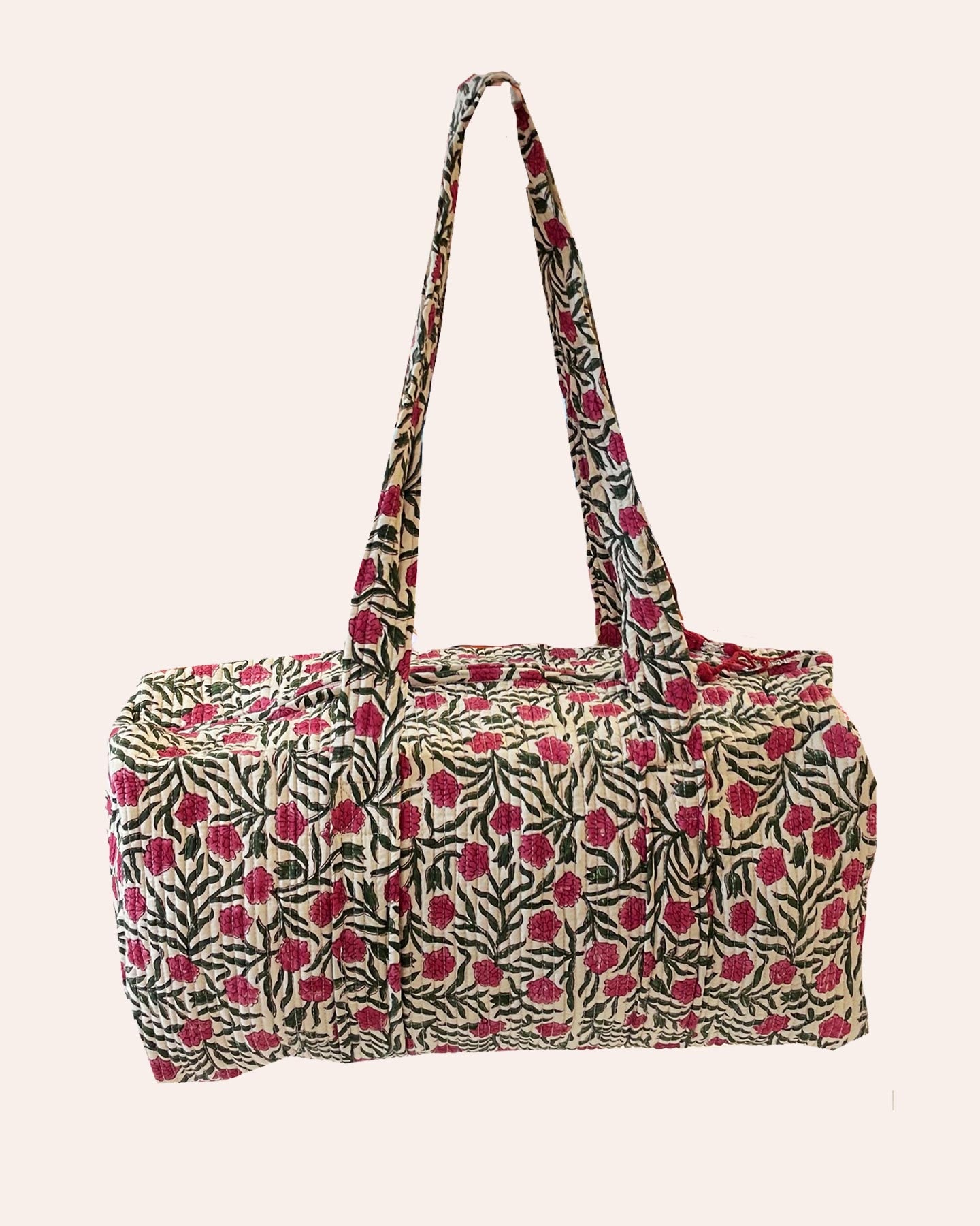 Borsa trapuntata di cotone stampato foderata con un tessuto diverso, si chiude con la zip ed ha una tasca interna ed una esterna. La Week Ender Bag è molto versatile, utile per un piccolo viaggio come bagaglio a mano e per un fine settimana al mare. Il nostro tessuto è unico nel suo genere e presenta delle irregolarità dovute alla lavorazione artigianale. Si consiglia il lavaggio a freddo, no asciugatrice.