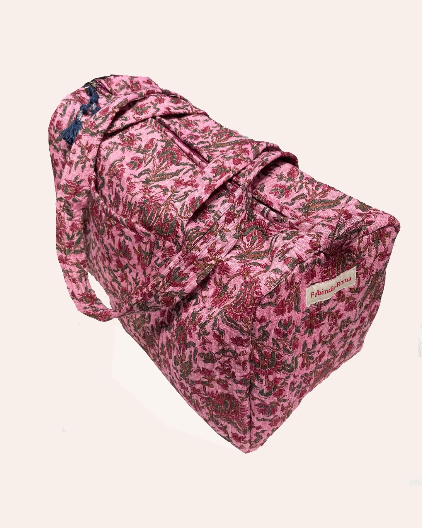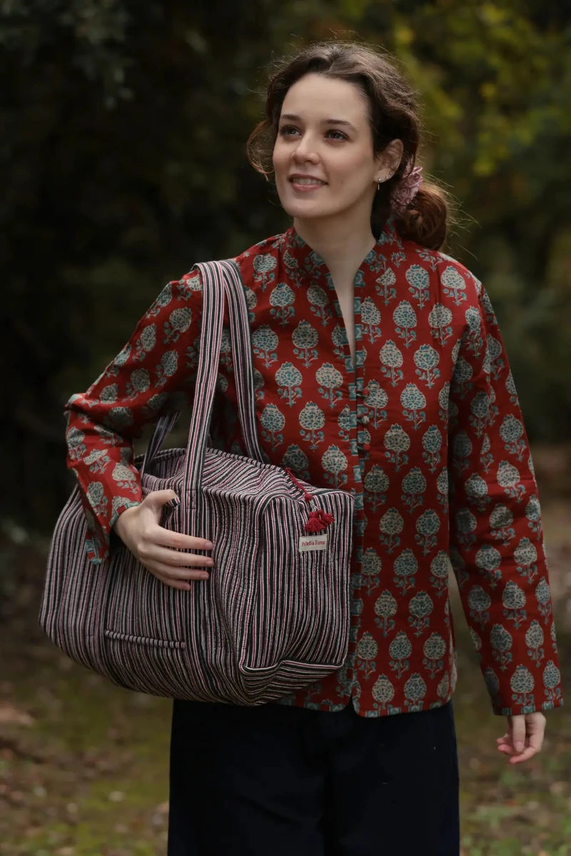 Borsa trapuntata di cotone stampato foderata con un tessuto diverso, si chiude con la zip ed ha una tasca interna ed una esterna. La Week Ender Bag è molto versatile, utile per un piccolo viaggio come bagaglio a mano e per un fine settimana al mare. Il nostro tessuto è unico nel suo genere e presenta delle irregolarità dovute alla lavorazione artigianale. Si consiglia il lavaggio a freddo, no asciugatrice.