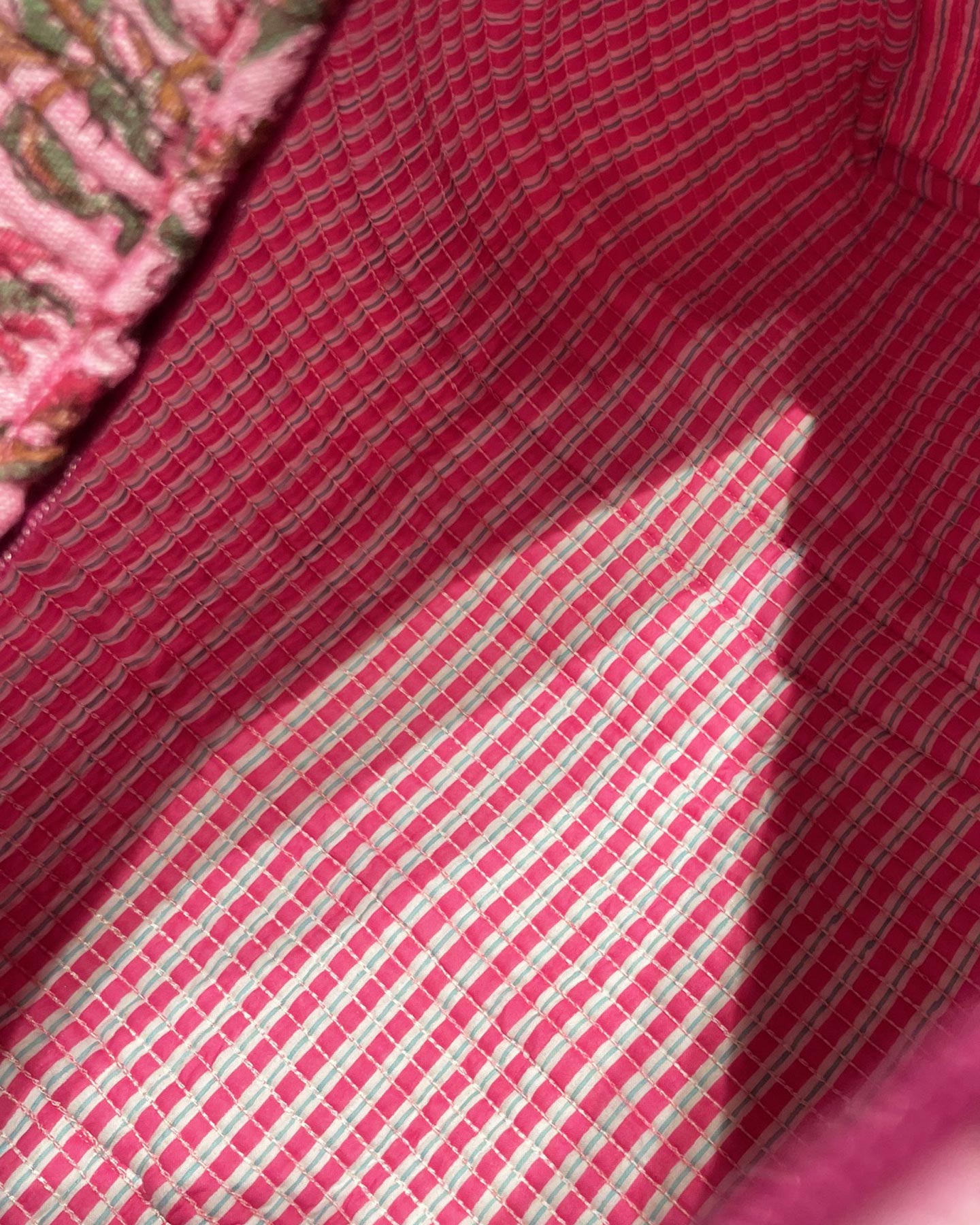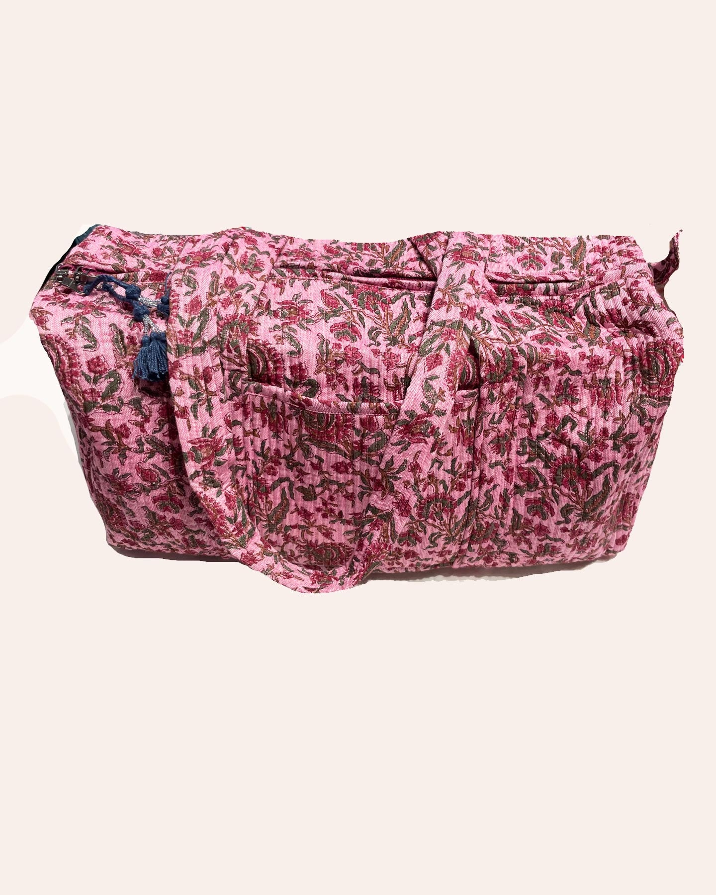 This quilted cotton bag  closes with a zip, it is lined with a fabric on contrast and has a small pocket outside and inside . The Week Ender Bag is a fun and useful bag, ideal for a short trip as hand bag luggage and for a sea side holiday. Our fabrics and designs are unique and may display irregularities due to craftsmanship. We recommend washing in cold water, no dryer.