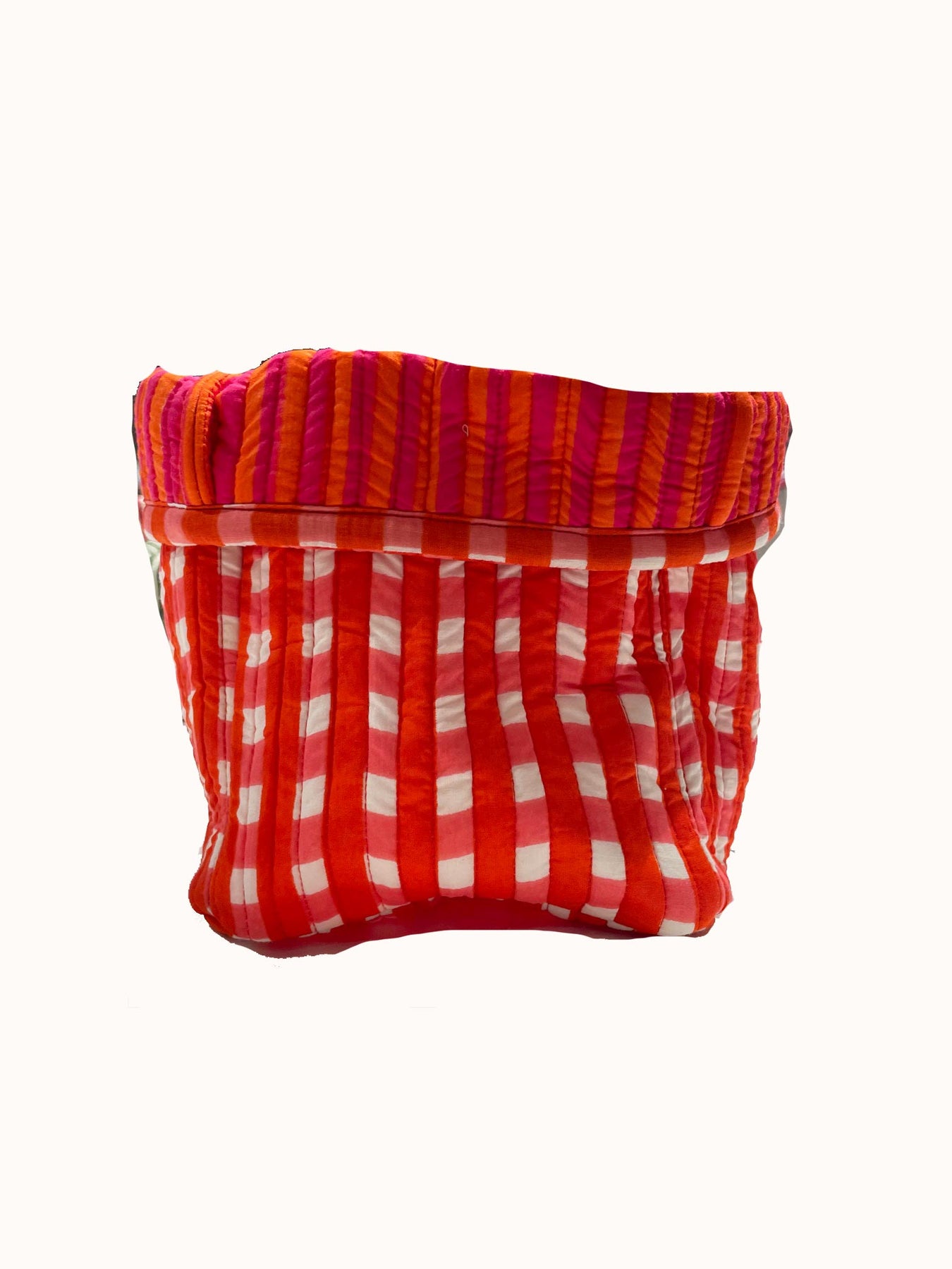 Small cotton quilted basket lined with a contrast fabric. This colorful basket is ideal for containing bread, biscuits, napkins and all sorts of small things.Our fabrics and designs are unique and may display irregularities due to craftsmanship. We recommend washing in cold water, no dryer.