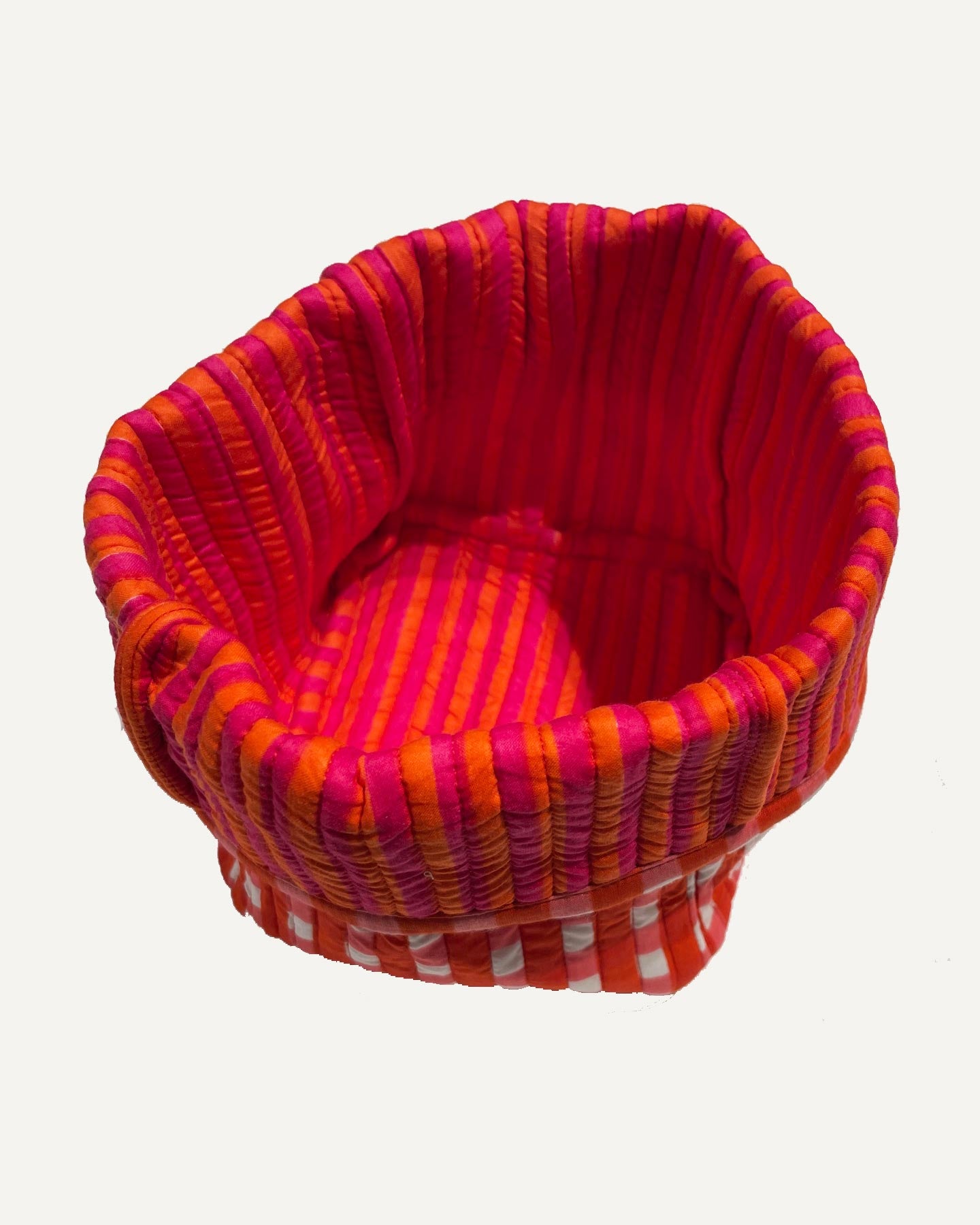 Piccolo contenitore a forma di cestino, di tessuto trapuntato stampato con fodera di altro colore. Questo cestino colorato e morbido, si adatta a molti utilizzi: porta pane, biscotti, tovaglioli, ecc. Il nostro tessuto è unico nel suo genere e presenta delle irregolarità dovute alla lavorazione artigianale. Si consiglia il lavaggio a freddo, no asciugatrice.