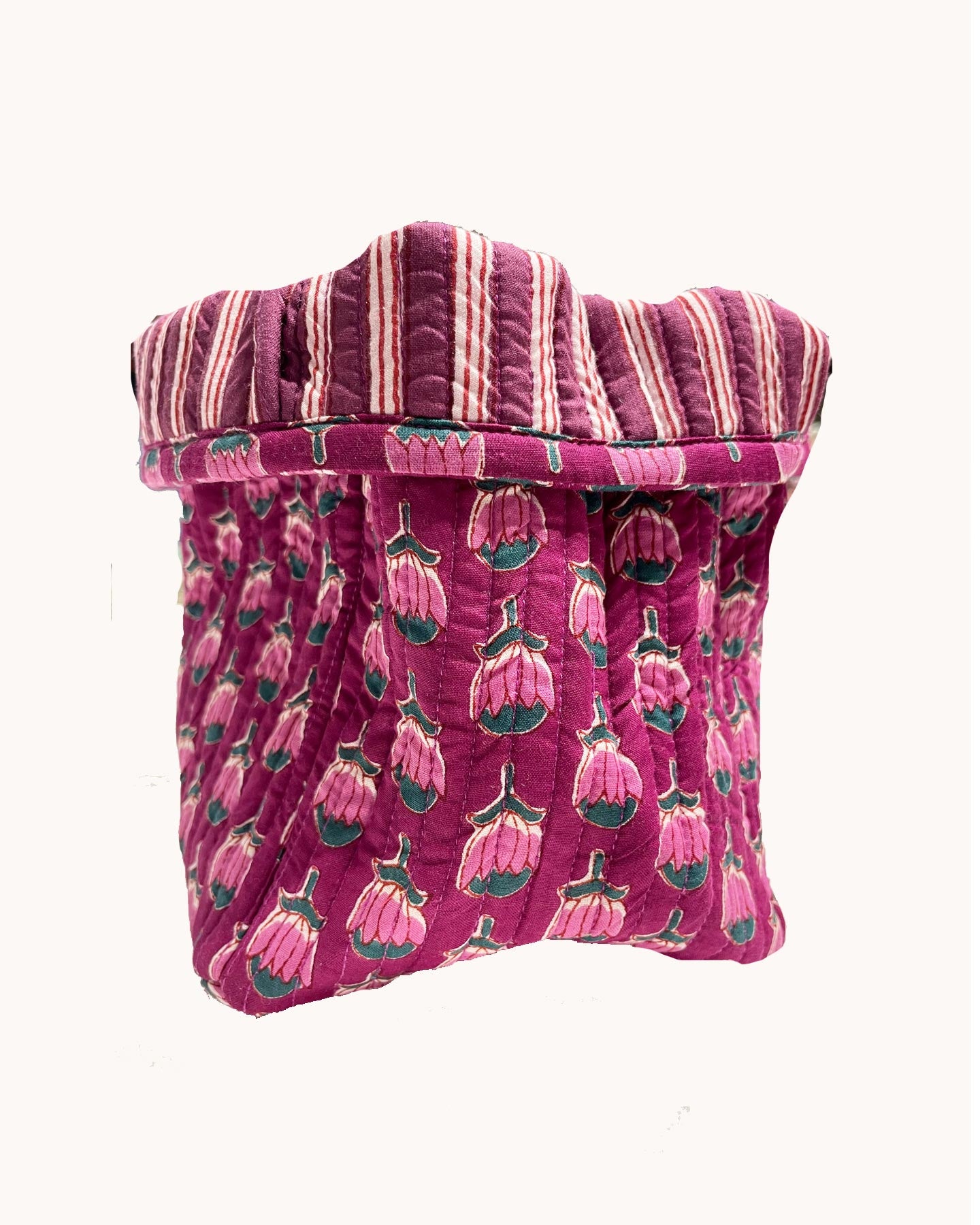 Small cotton quilted basket lined with a contrast fabric. This colorful basket is ideal for containing bread, biscuits, napkins and all sorts of small things.Our fabrics and designs are unique and may display irregularities due to craftsmanship. We recommend washing in cold water, no dryer.