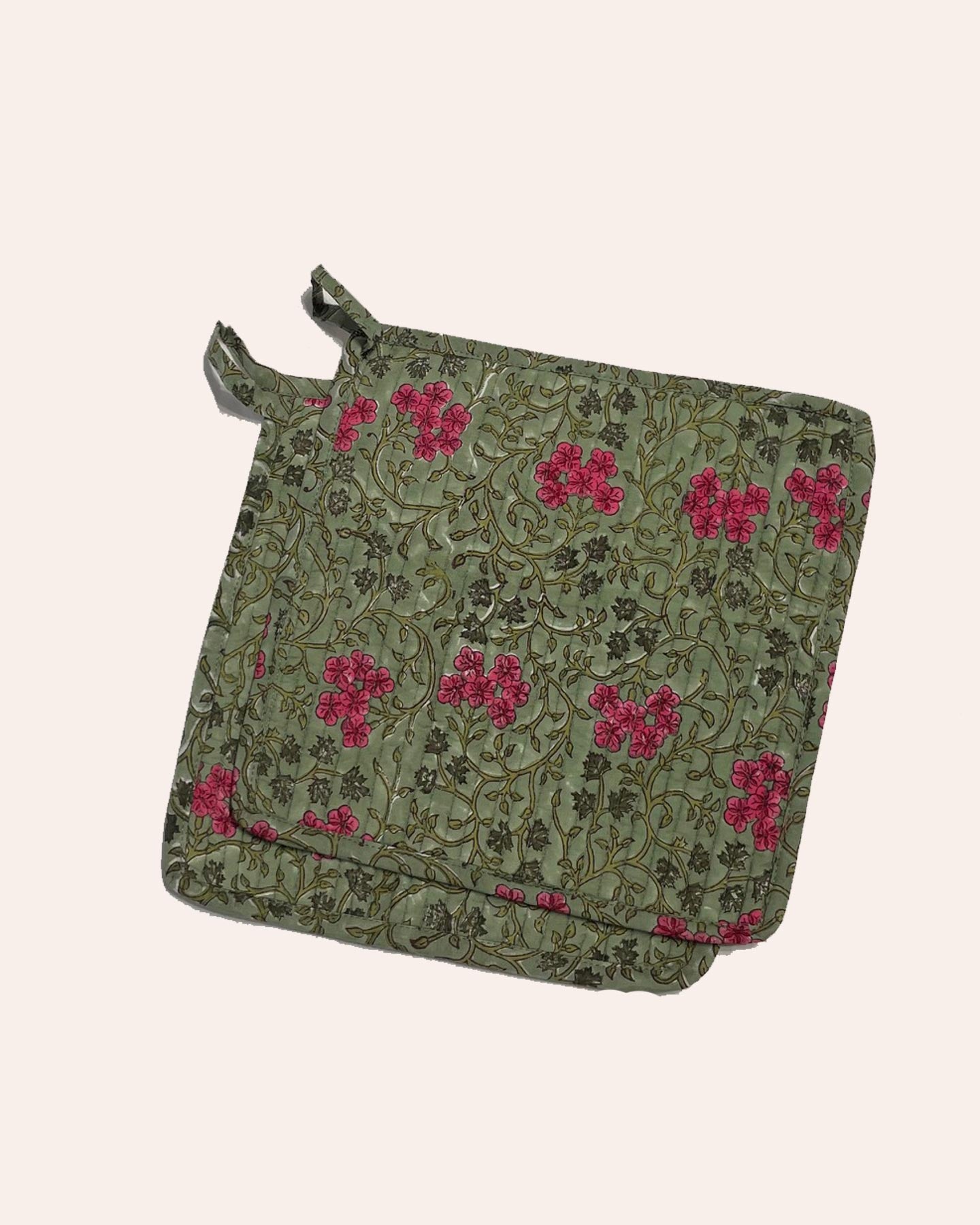 Set di due pezzi di presina da cucina di 100% cotone stampato, trapuntato e con imbottitura di cotone. Colora la tua casa con dei tessuti divertenti. Il nostro tessuto è unico nel suo genere e presenta delle irregolarità dovute alla lavorazione artigianale. Si consiglia il lavaggio delicato, no asciugatrice.
