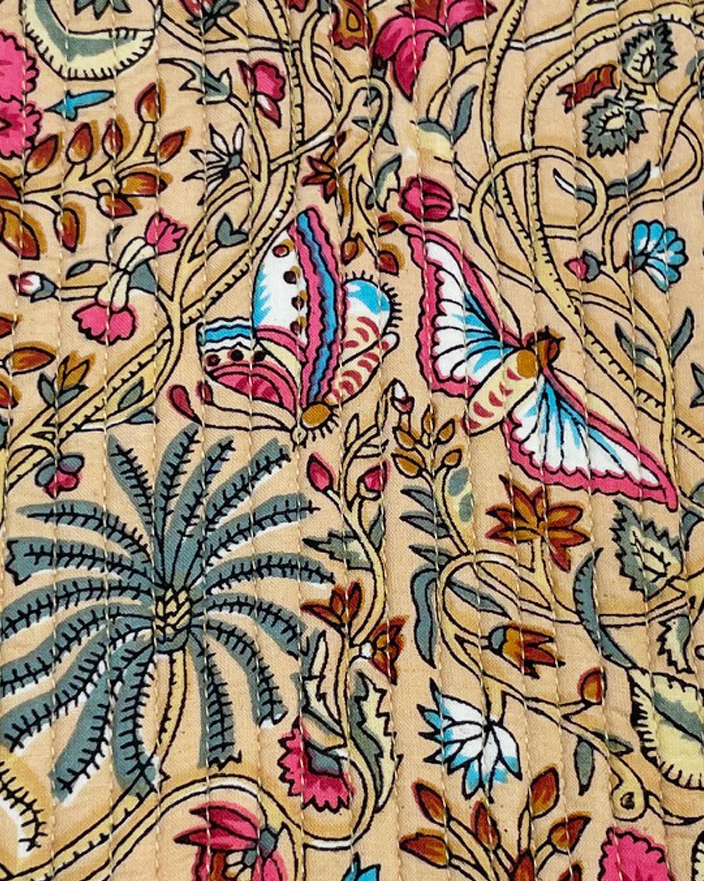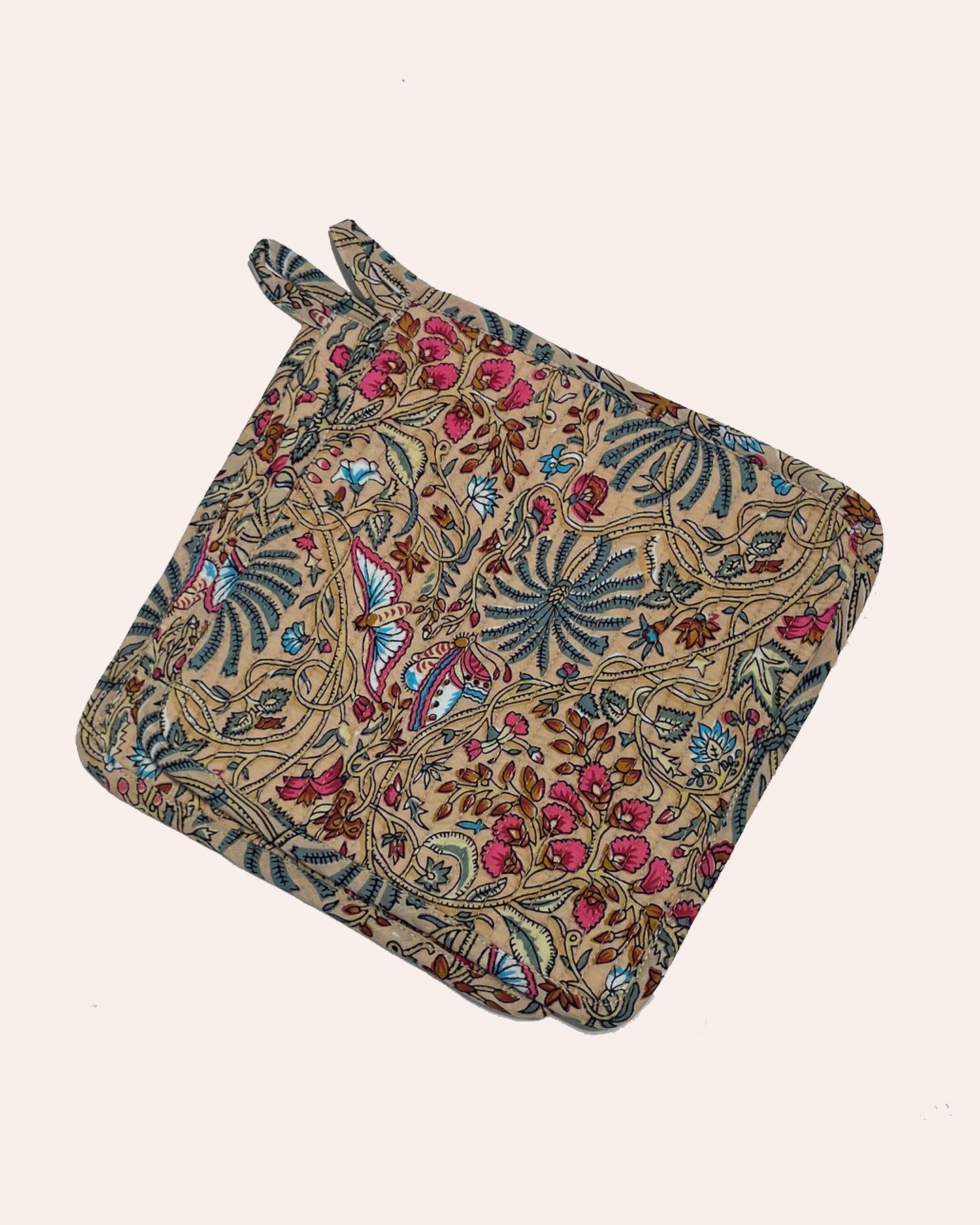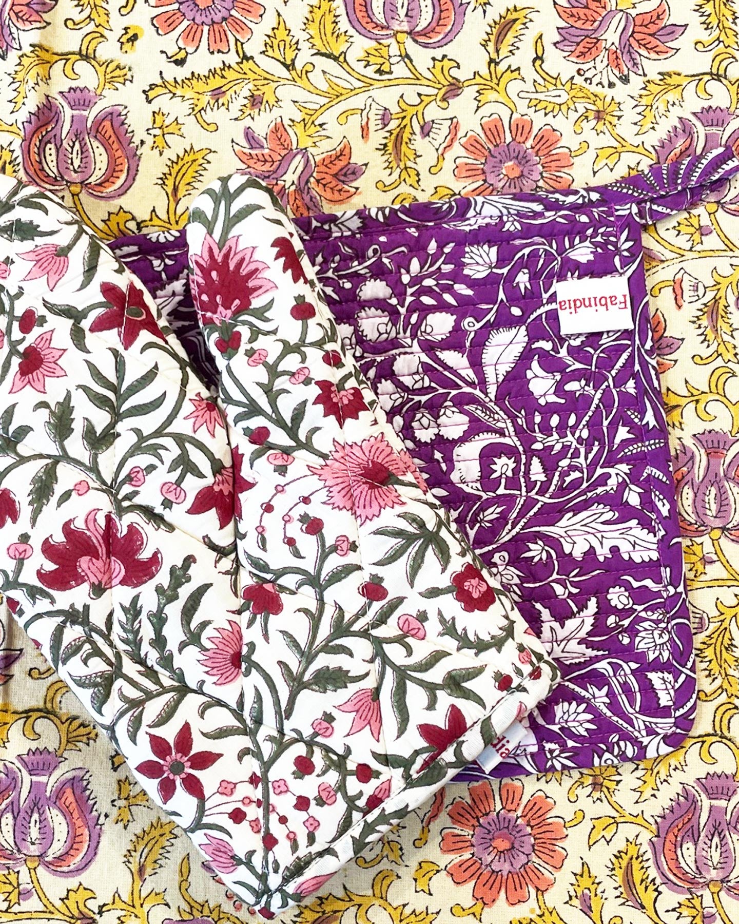 Set di due pezzi di presina da cucina di 100% cotone stampato, trapuntato e con imbottitura di cotone. Colora la tua casa con dei tessuti divertenti. Il nostro tessuto è unico nel suo genere e presenta delle irregolarità dovute alla lavorazione artigianale. Si consiglia il lavaggio delicato, no asciugatrice.